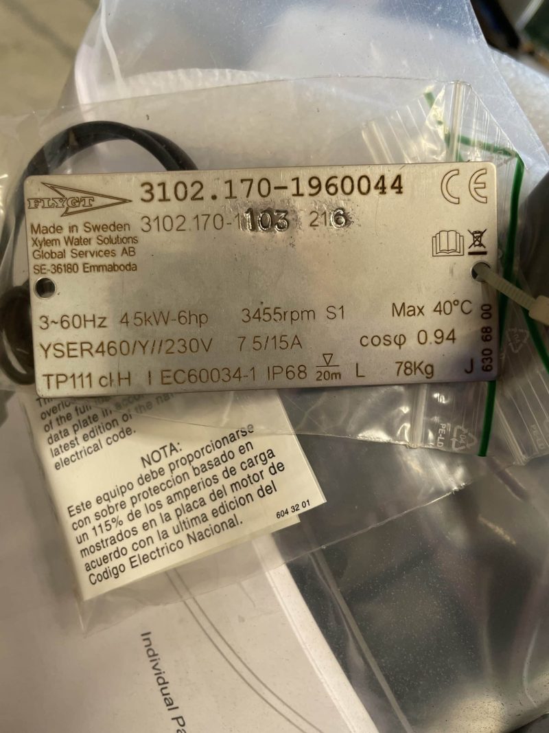 Flygt Model# MP-3102.170 2″ volute 6hp 230v 216 impeller